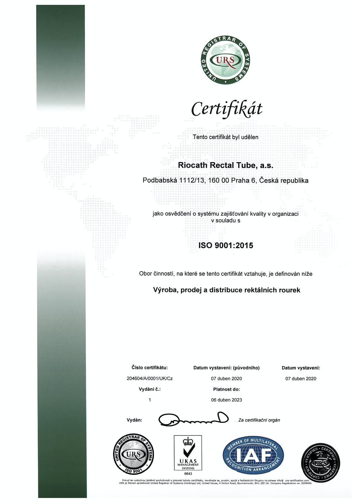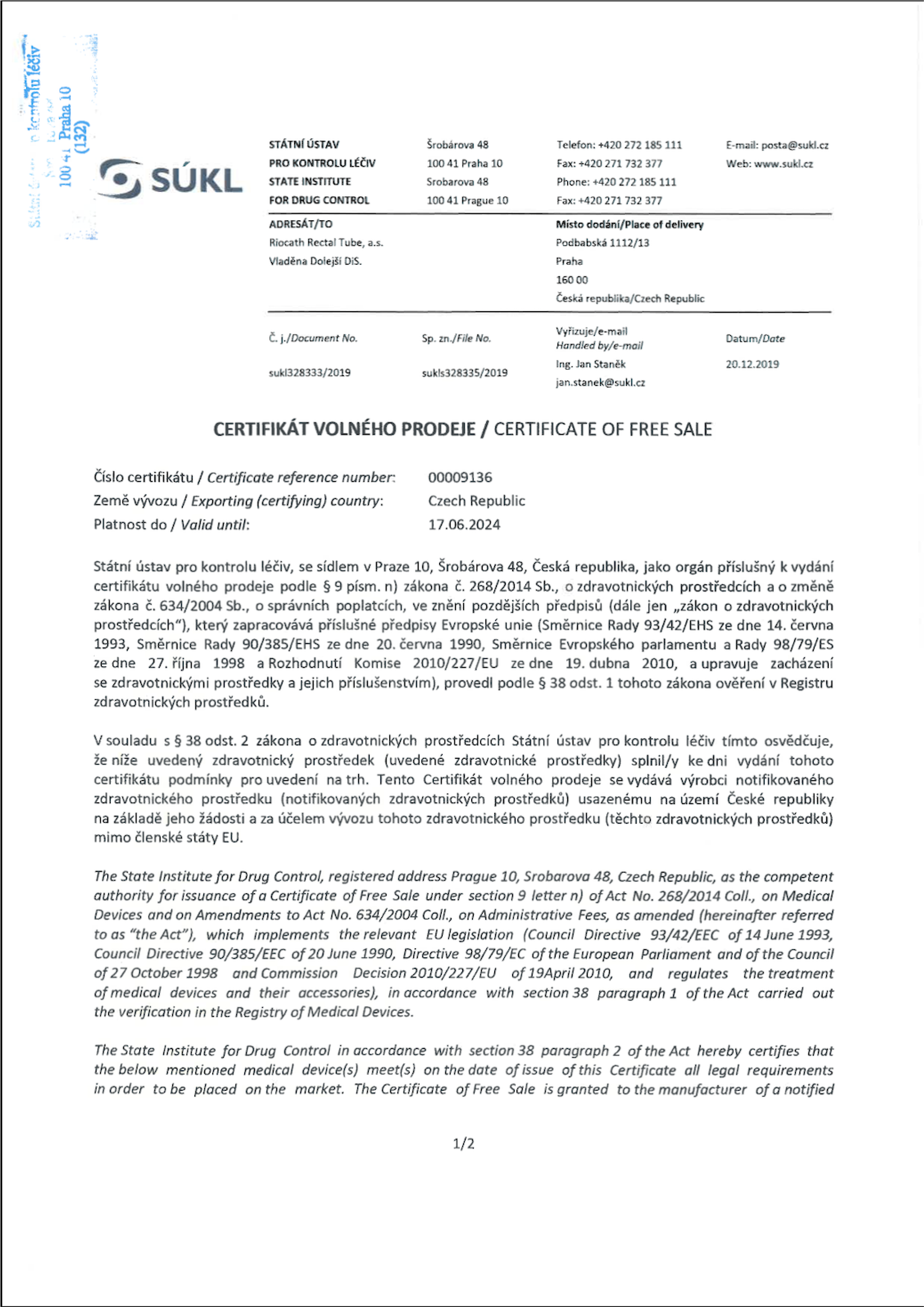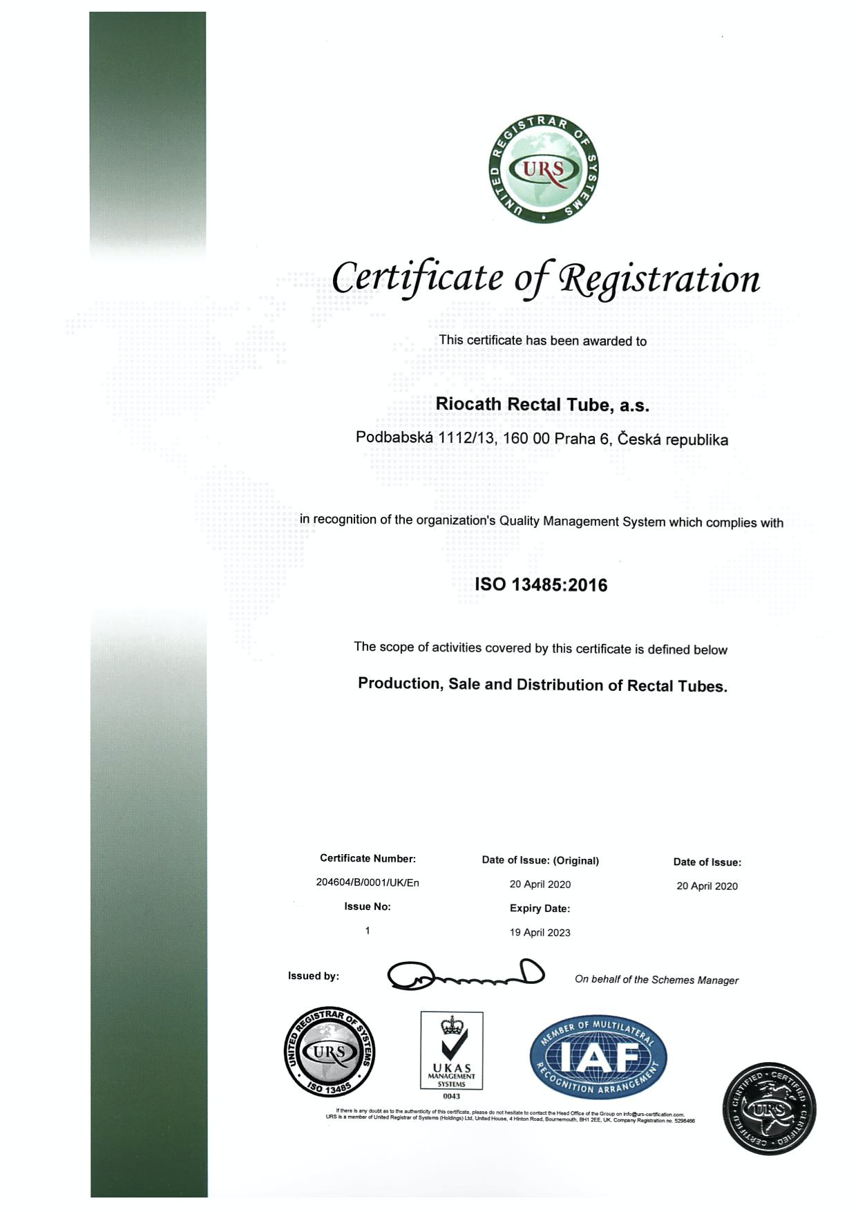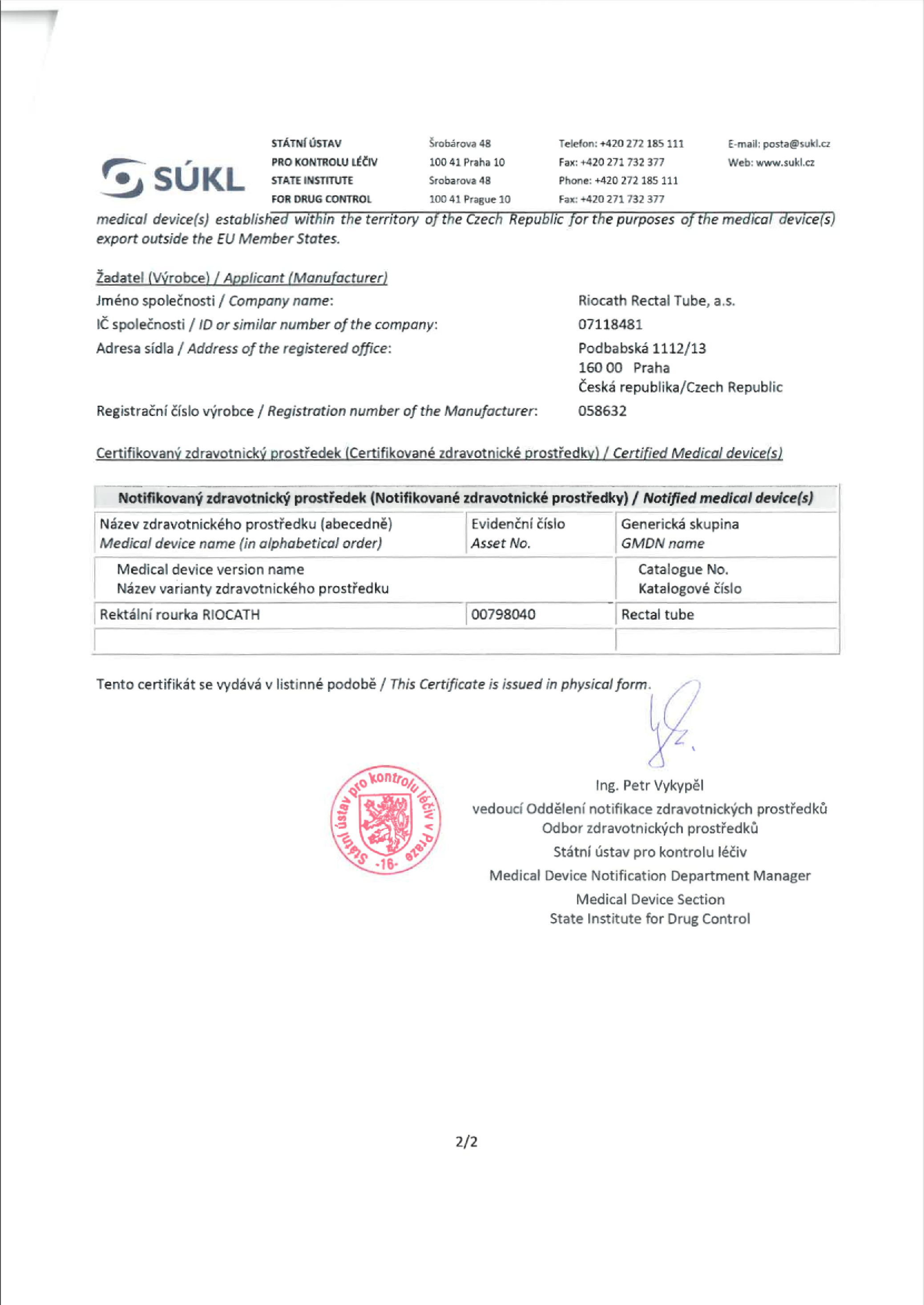 Rektální rourka RIOCATH byla certifikována Státním ústavem pro kontrolu léčiv.
